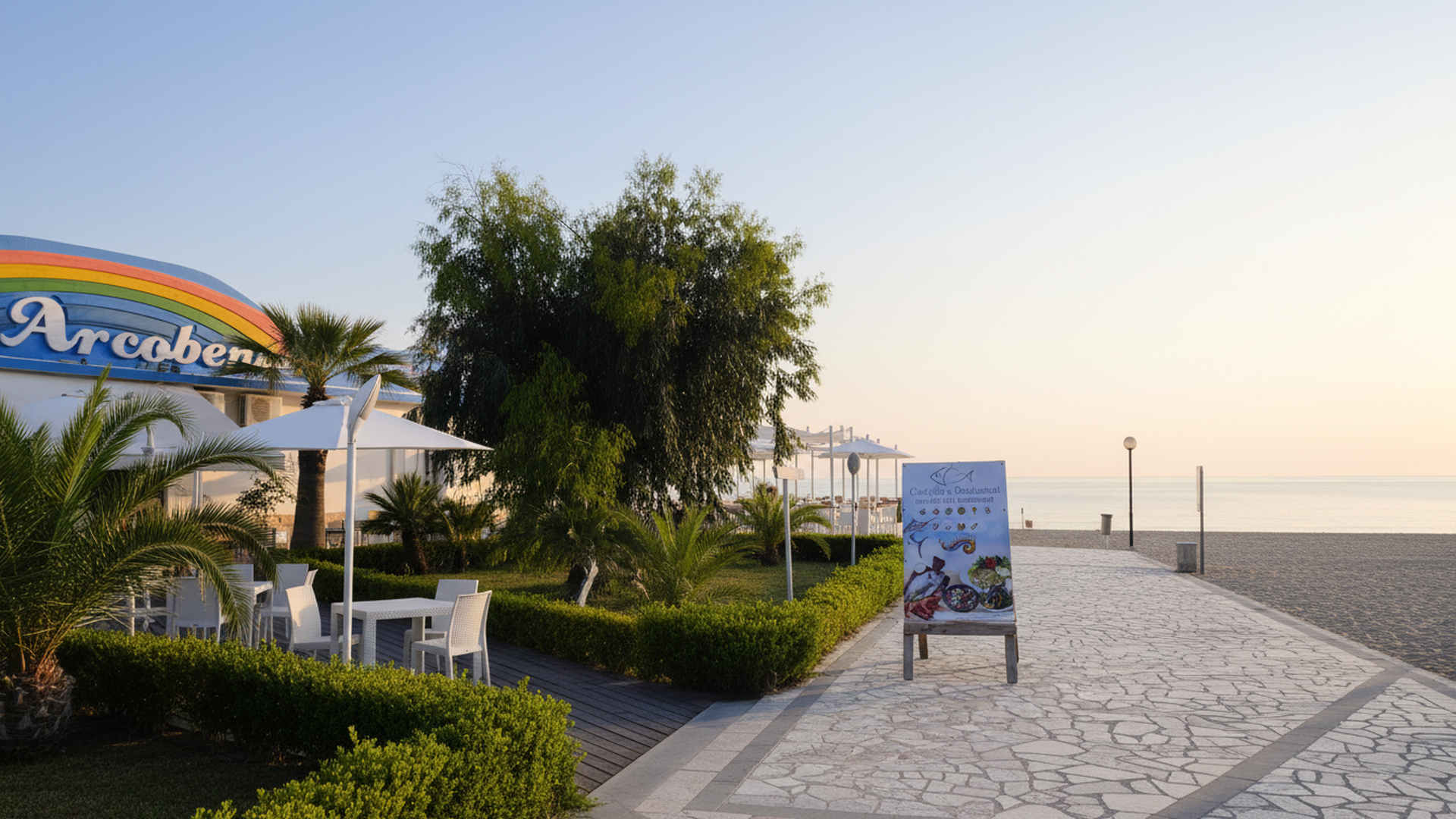 Una spiaggia attrezzata dove rilassarsi al sole e fare il bagno nelle acque cristalline del Mediterraneo.